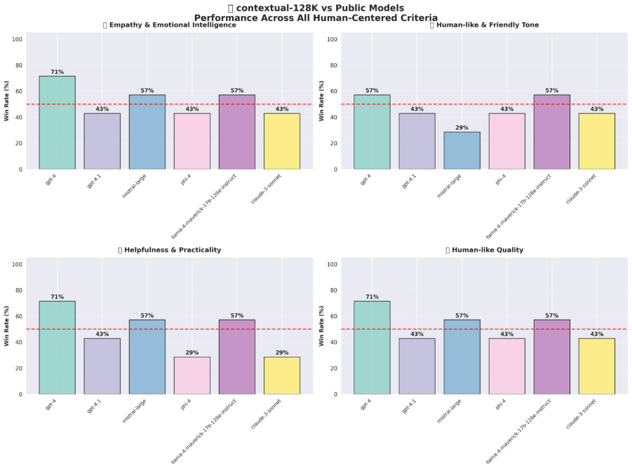 - Contextual-128K: Attained a 52.4% win rate (7.8/10 avg score), with strong empathy (up to 71.4%) and relevance (up to 71.4%), beating GPT-4 (7.5/10) in complex query handling.